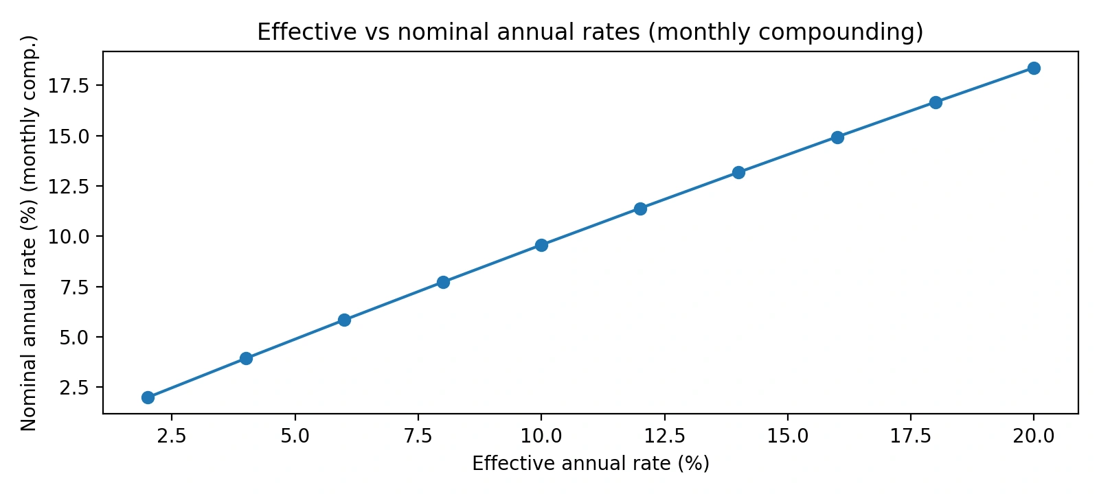 Chart: Effective vs nominal rates (monthly compounding)