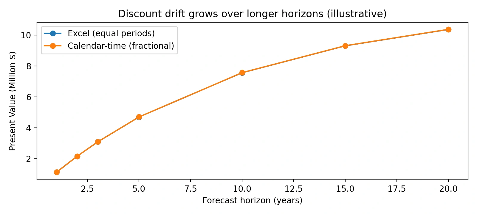 - Small differences in timing compound across long forecast lives, creating noticeable discount drift.